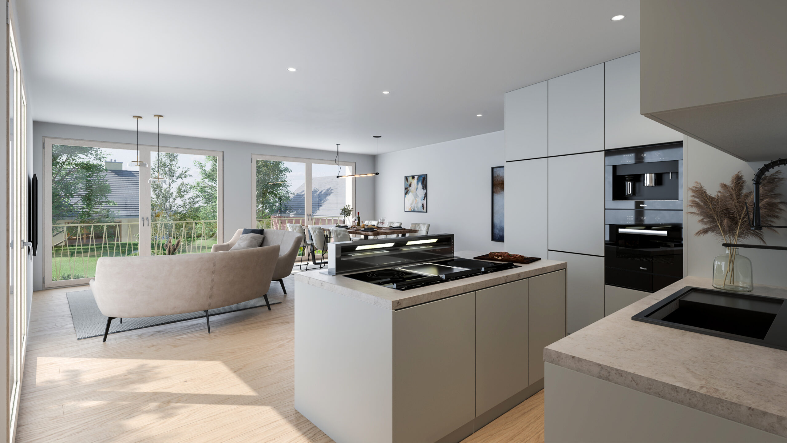 – Offener Wohn- und Essbereich mit moderner Küche und Kochinsel
