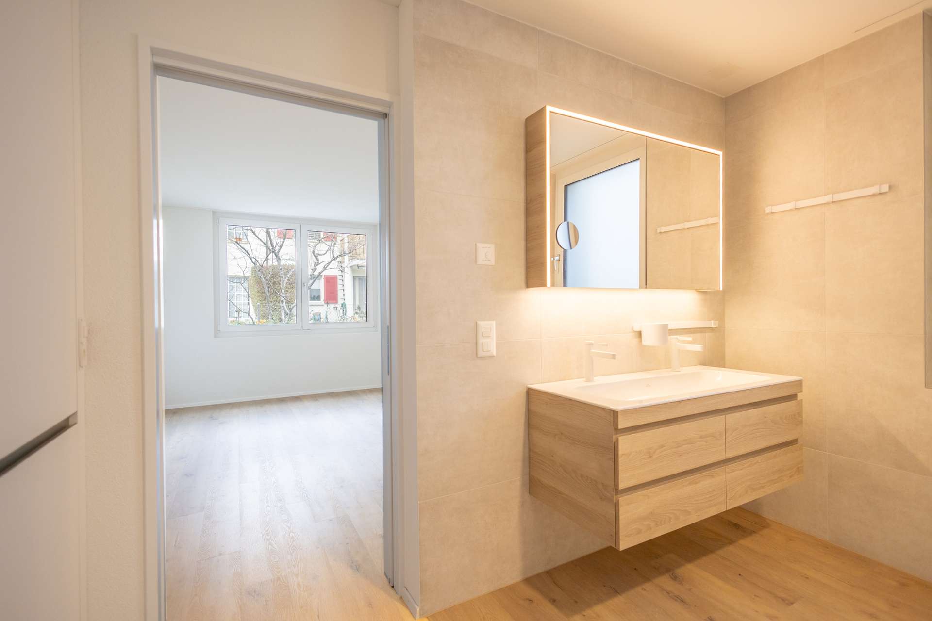 Eine Fussbodenheizung mit Einzelraumregulierung sorgt für Wohlfühlklima. Insektenschutzgitter, integrierte Vorhangschienen und ein intelligentes Lichtsystem schaffen Komfort und Atmosphäre.