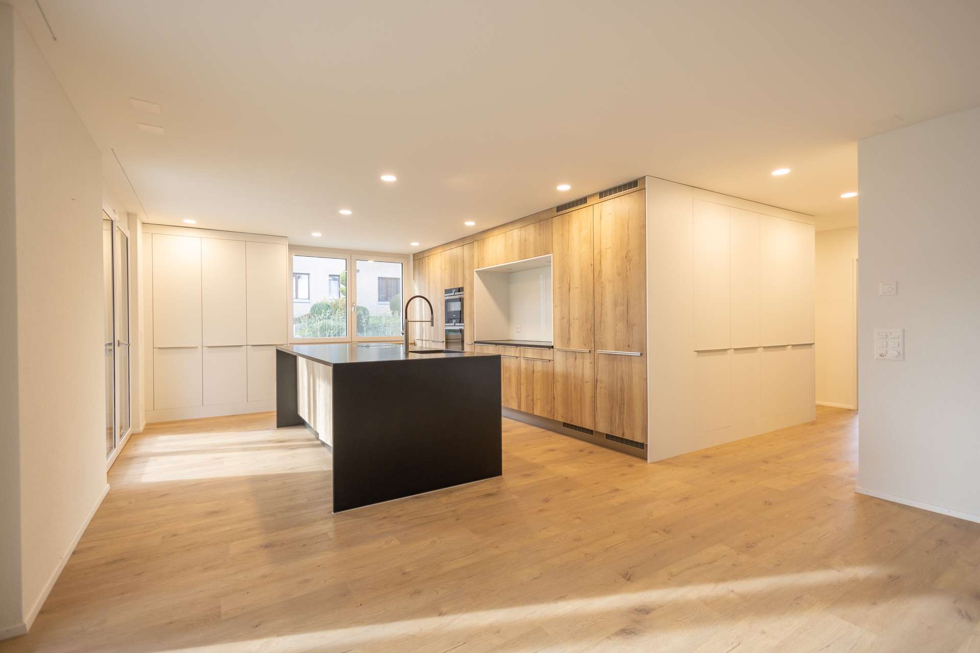 Der 55 m² grosse Wohn-, Ess- und Kochbereich besticht durch bodentiefe Fenster, die für viel Licht und einen herrlichen Blick ins Grüne sorgen. Die überdachte Terrasse mit elektrischen Lamellen und Markisen lädt zu entspannten Stunden im Freien ein.